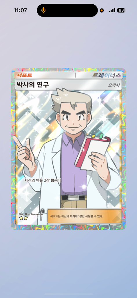 "포켓몬 카드게임 Pocket" 카드 판매합니다. ★★박사의 연구 : 25,000원 ★★박사의 연구 * 2장 세트 : 48,000원 ★★2성★★ 인기 서포트 카드 (태홍 흉내 릴리에) : 15,000원 ★★2성★★ 서포트 카드 (카르네 관광객 등등) : 12,000원 ♣이로치♣ 카드 (춤추새 개굴닌자 피츄 등등) : 12,000원 ★★2성★★ 포켓몬스터 카드 (메가캥카 이상해꽃 등등) : 10,000원 *모든 제품은 가장 구하기 어려운 근본 일어판으로 제공됩니다 *한국어, 영어 선택가능 *2장이상 구매시 할인