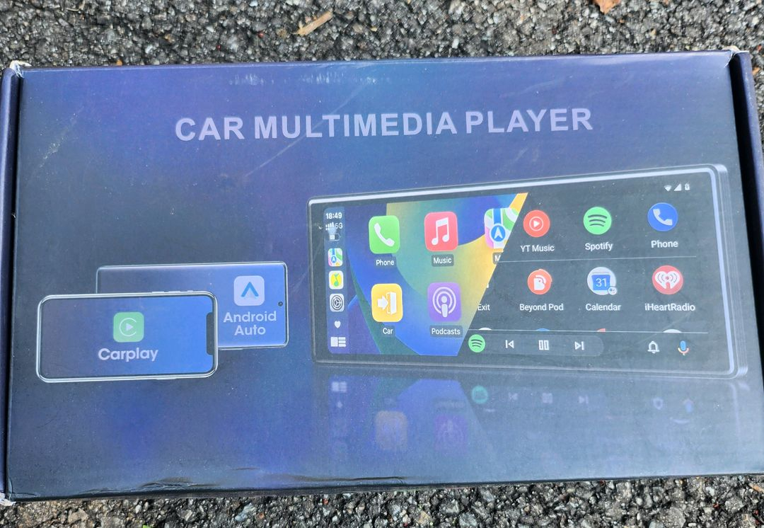 차량용 안드로이드 올인원 네비게이션이에요. 카플레이, 앰버라이트, 음악 재생 등 다양한 기능을 지원하며 박스 포장 상태가 양호해 보입니다.