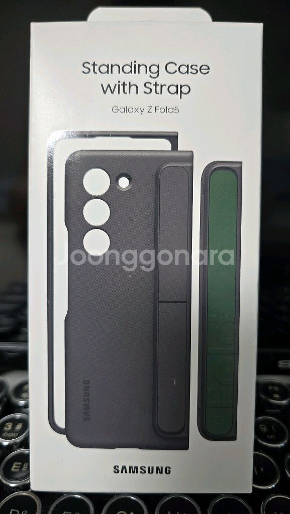 삼성 갤럭시 Z폴드5용 정품 스탠딩 케이스예요. 박스 포장 상태로 새 제품 미개봉 제품입니다, 스트랩이 있어서 폴더블폰 사용할 때 편리할 것 같아요. 편의점 반값택배 발송합니다.