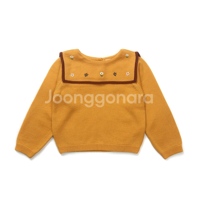 카라에 예쁜 꽃자수가 놓여있는 룰라비 니트입니다. 머스타드 색상이고, 택달린 새상품입니다