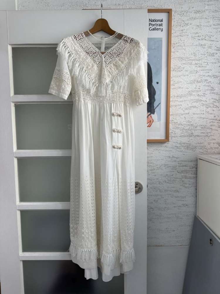 개인정보(거래정보)를 주고받는 행위는 사기에 노출될 수 있으므로 즉시 중고나라로 신고해 주세요Christian Dior의 흰색 롱 원피스입니다 레이스와 펀칭 디테일이 돋보입니다 약간의 얼룩이 있지만, 전체적으로 좋은 컨디션을 유지하고 있습니다 이너도 같이 있습니다