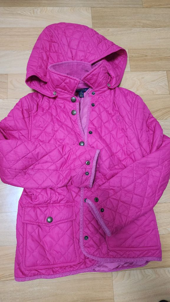 폴로 걸즈 퀼팅자켓입니다. 사진보다 색감 예뻐요. 사이즈는 L(12-14) 입니다. 초 3-6 학년 또는아담한 성인분도 맞는 사이즈예요. 모자는 탈부착 가능합니다. 소매부분 때탐 조금 있지만 전반적으로 상태 양호합니다.