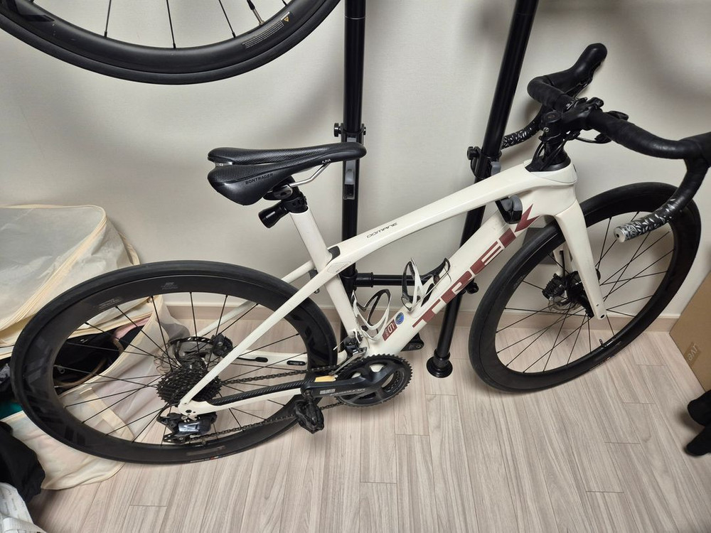 흰색 트렉 도마니 로드자전거입니다 sl6 카본프레임 + 아비아브 휠(100만원상당) 교체했습니다 울테그라 체인 교체후 사용안함. 타이어 교체후 거의 사용안했습니다~ sl6는 요즘 400정도하더라구요 자전거 타려고 준비해놓고 갑자기 임신하는 바람에 정리합니다 47사이즈 입니다 여성 155-165까지는 가능 할거 같아요 저는 161입니다~