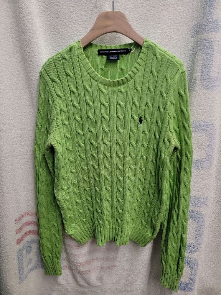 폴로 랄프로렌의 시그니처 케이블 니트 패턴이 돋보이는 그린 컬러 니트예요. 라운드넥 디자인으로 깔끔하고 세련된 느낌이며, 상태도 양호해 보입니다. 실측은 가슴 46 총장 56 사이즈 M 택배비 3500원 반품 환불 없으니 참고해 주세요 구매는 채팅 주세요