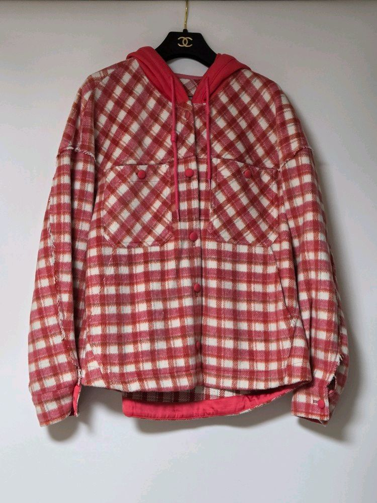 편안하게 입기 좋은 한섬 더스토어 THE STORE 체크 후드 점퍼. 2020년 매장 구입 P품번 소재 폴리에스터 49, 아크릴 25, 레이온 8, 면 8, 나일론 7, 모 3%. 배색 후드 부분 면 100% 택 기재 82-94-160, S사이즈로 실측 가슴 반품 58, 기장 후드 아래 67cm