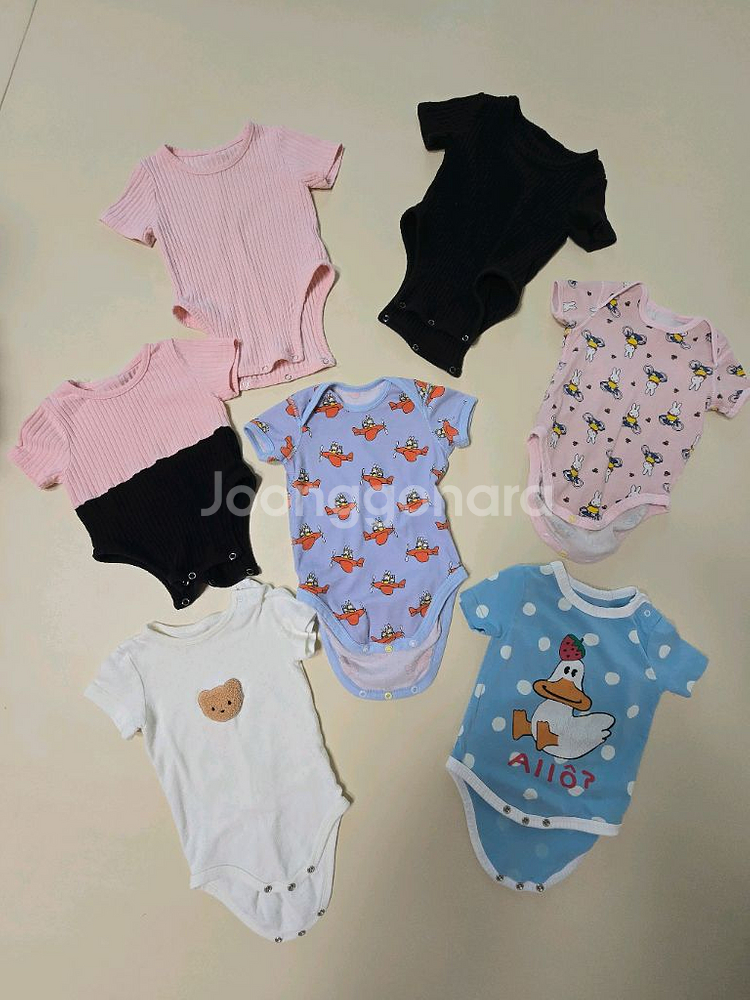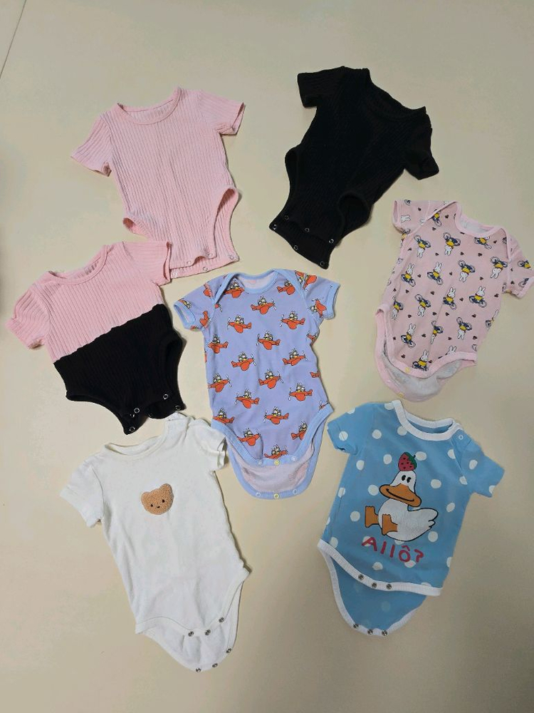 신생아용 바디수트 8벌 일괄 판매해요. 다양한 색상과 패턴으로 구성되어 있고, 전체적으로 깔끔한 상태입니다. 신생아부터 돌 전후까지 입히기 좋은 사이즈예요.