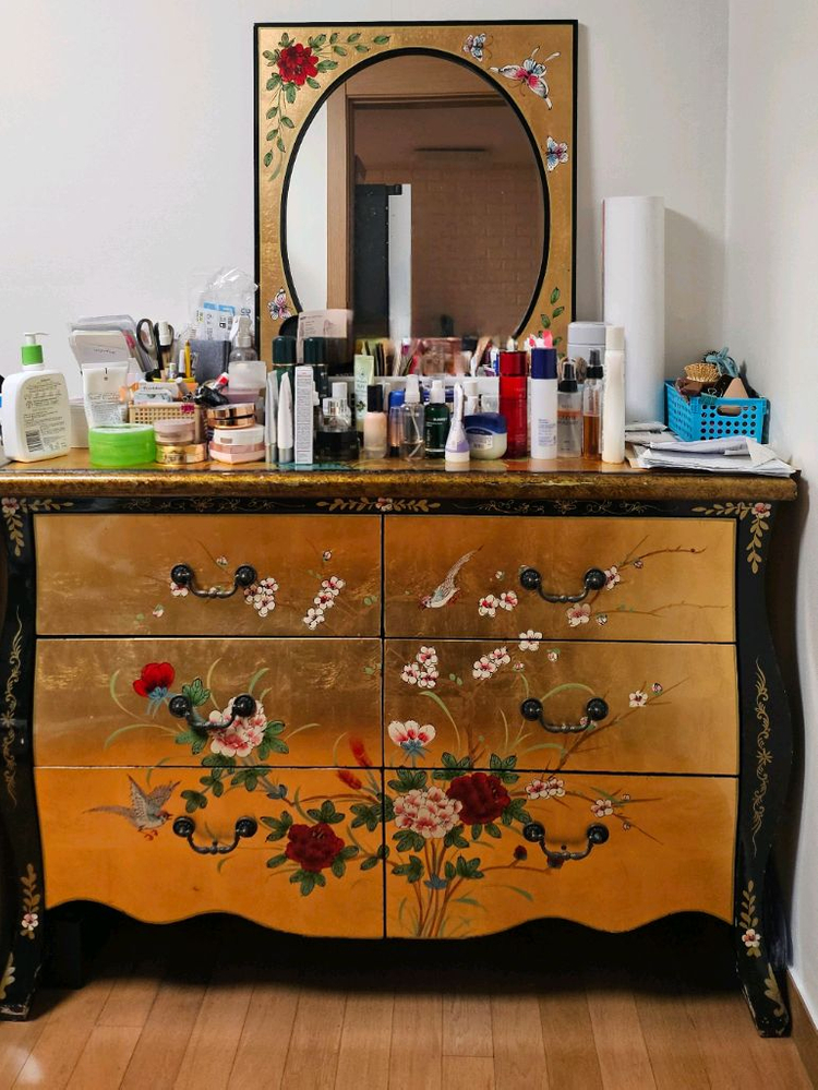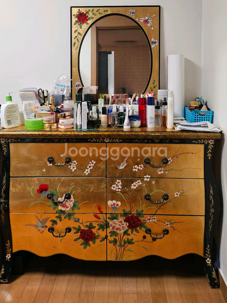 앤틱한 느낌의 나비 장식장 가구 세트입니다. - 수납장2개, TV장, 화장대, 스툴 구성입니다 - 검정색과 금색의 조화가 고급스러워요 사용감은 있지만 전체적으로 상태는 괜찮습니다 엄마가 애착가지고 사용하셨는데, 이사로 내놓습니다. 이사날 1층까지는 내려드릴수 있고 한꺼번에 가져가시려면 용달/화물이 필요할 것 같습니다. 먼저 연락주신 순서대로 거래할게요~