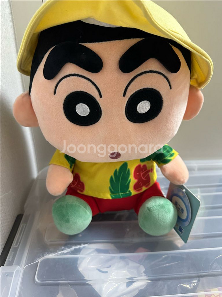 노란 모자와 하와이안 옷을 입고 있는 귀여운 짱구 인형입니다. 새상품이고 컬렉션용이나 선물용으로 좋을 것 같아요.