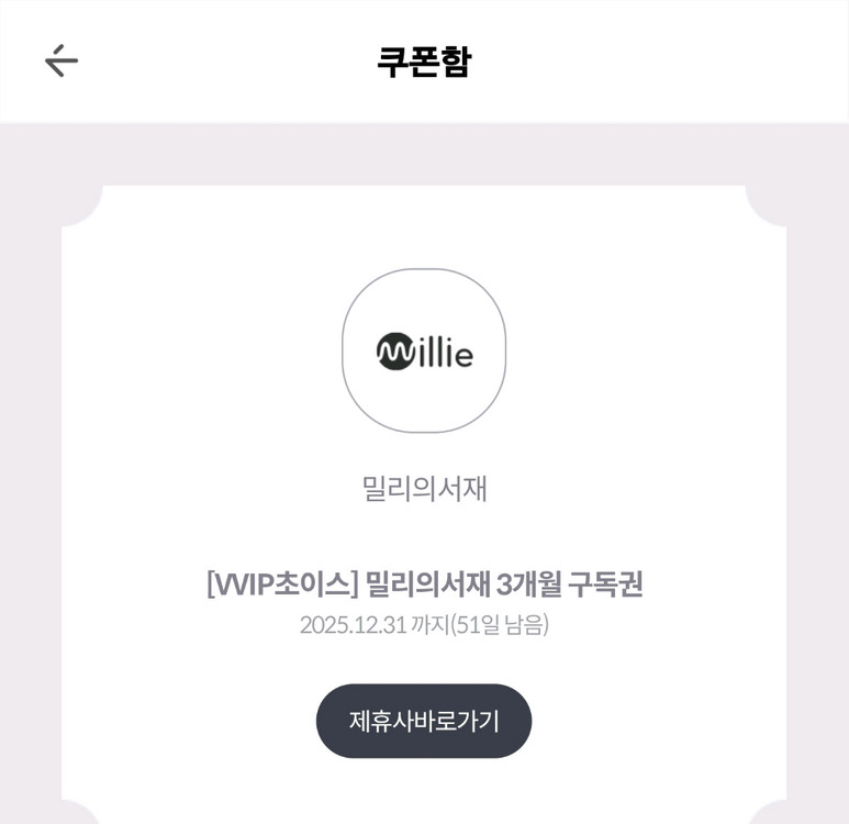 개인정보(거래정보)를 주고받는 행위는 사기에 노출될 수 있으므로 즉시 중고나라로 신고해 주세요밀리의서재 3개월 구독권 판매해요! 2025년 12월 31일까지 사용 가능하고, 깨끗한 상태입니다.
