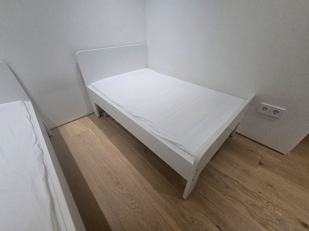이케아 슬렉트 침대+매트리스 판매합니다. - SLÄKT 슬렉트 길이조절침대+갈빗살, 화이트, 80x200 cm - NATTSMYG 낫스뮈그 길이조절 침대용 폼 매트리스, 80x200 cm - 현재 구입시 정가 383,000원입니다. 아이 두명 사용했던 길이조절 침대입니다. 길이조절이라 최소 135cm이며 205cm까지 조절되고 폭이 좁아서 공간활용에 좋습니다. 한방에서 쓰다가 나중에는 따로 방을 만들어주고 어느정도 클때까지 쓸 생각으로 구매했는데 2층 침대 들이면서 마땅히 둘곳도 없고.. 아쉽지만 처분하려 합니다. 침대 밑에 수납박스 같은 것도 넣을 수 있어서 계절이불, 계절옷 보관해두기도 좋습니다. 프레임은 사진찍고 분리해뒀고 매트리는 전체 길이를 사용안해서 구매했을 때 비닐안에 다시 넣어둬서 승용차에 가지고 가실 수 있습니다. 마땅히 둘곳도 없고 빠르게 처분하고자 합니다. 2개 다 구매하시거나 하나라도 구매의사 있으시면 가격 조정도 생각중입니다. 연락주세요! 송파구 문정역 근처입니다.