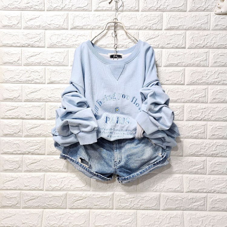 프리사이즈입니다 (77언냐들 가능해요) 하늘색 파리 레터링 맨투맨입니다. 넉넉한 오버핏으로 편하게 입으실 수 있습니다. 레터링 프린팅이 포인트로 들어가 있어서 더욱 예뻐요. 편하게 입기 좋아요 상태양호합니다 가슴반품 62 길이. 68 반품환불 안대요 신중구매주세요