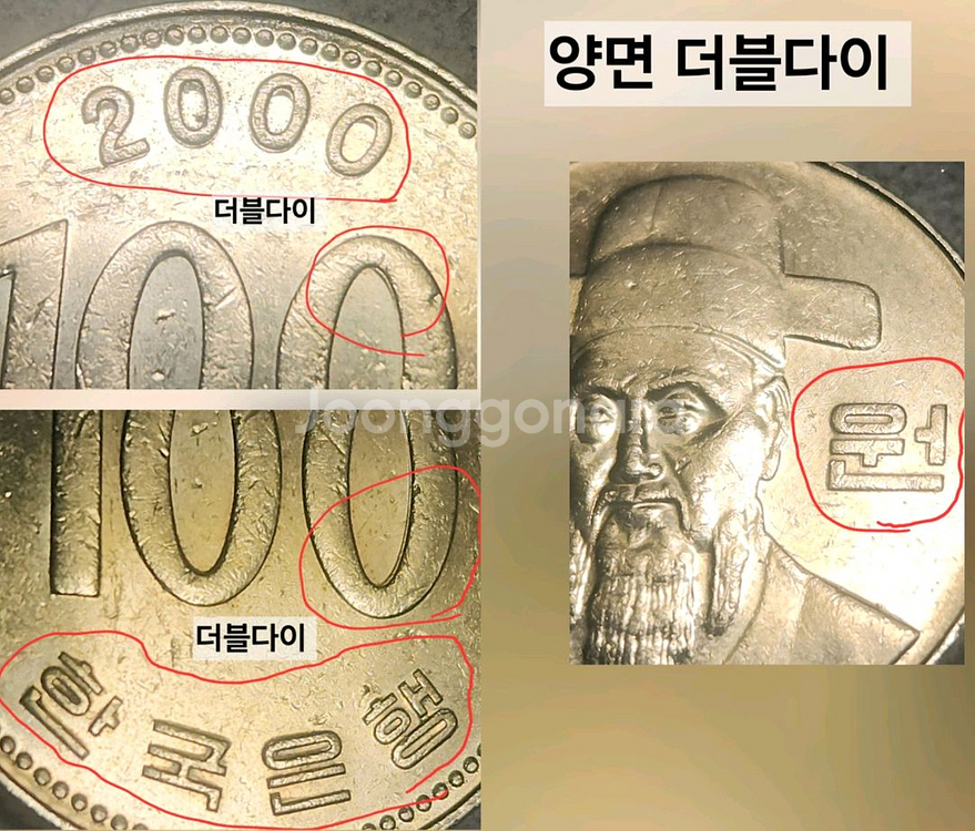 한국은행 주화 2000년 100원 에러주화입니다. - 양면 모두 더블다이 주화입니다. - 양면 모두 글자들이 더블다이 에러 주화입니다. * 사진은 실물사진입니다. * 택배비는 별도입니다.