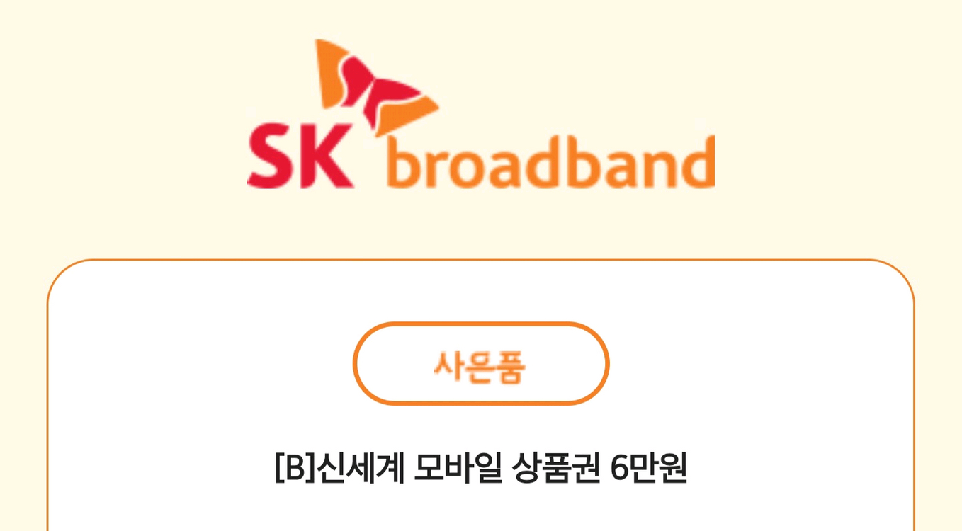 SK브로드밴드에서 발행한 신세계 모바일 상품권 6만원권입니다. 유효기간 26.10.24까지 이마트 & 이마트 트레이더스 모든 매장 안에 있는 상품권 숍(안내 데스크 및 키오스크)에서 위 교환권으로 종이 상품권을 받을 수 있 음 (※백화점 및 면세점에서 교환할 수 없음) 안내데스크: 본인 확인을 위해 신분증 확인하고 상품권 증정 - 키오스크: 쿠폰번호 입력 후 다음화면에서 인증번호 입력 (종이 상품권으로 교환 후 반품할 수 없음) 문의: 1566-5415(유료/평일 09시~18시, 점심시간(12시~13시) 및 주말/공휴일 미운영)