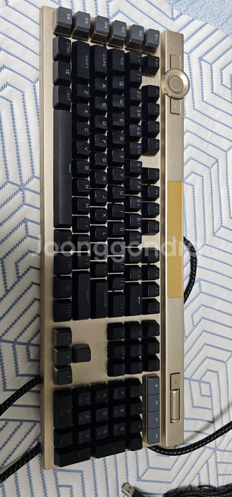 커세어 K100 RGB OPX 영문키캡 미드나잇 골드 2021년 12월 구매~2024년 9월까지 실사용 사용감 있으며 일부 하자가 있습니다. 1. 사진상 넘버패드 0 스위치 파손(기능문제 없음) 2. 스위치 컨트롤, 볼륨 컨트롤 등 다이얼 정상인식 안함 3. 더스트커버, 손목 받침대 없음