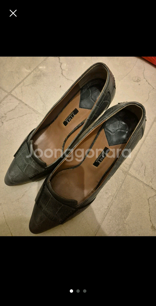 여성용 구두 240사이즈예요. 블랙 컬러에 브라운 솔로 깔끔하고 세련된 디자인이에요. 상태 양호한 중고 제품입니다.