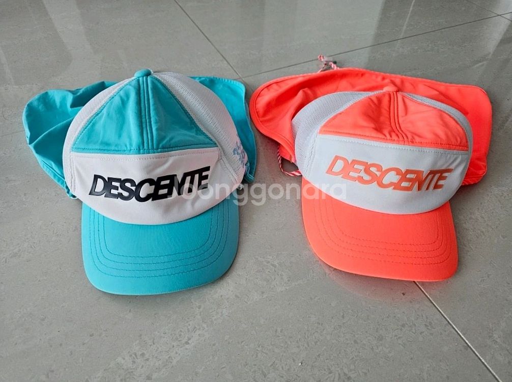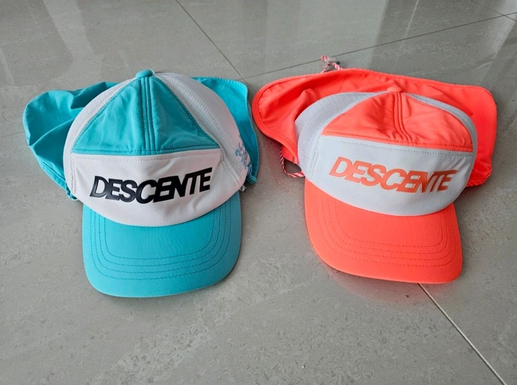 데상트 수영모자 - 색상: 파란색, 오렌지색 - 햇빛 가리개 부착되어 있어 햇볕이 강한 날 유용합니다 - 상태좋아요 뒷목도 가려줘서 좋음 1회착용 수영장 바닷가에서 유용 굿 한개당 만원