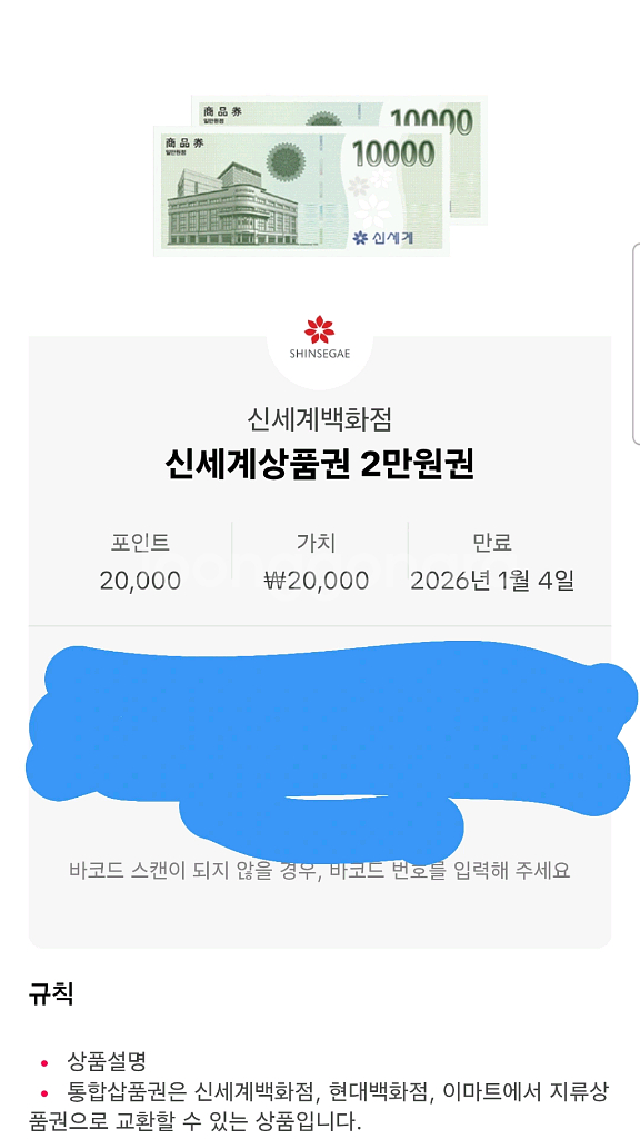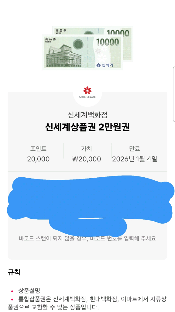백화점에서 사용 가능한 2만원 상품권이에요. 유효기간은 2026년 1월 4일까지라서 빠른 거래 원해요! 지류로 교환할 수 있는 상품권이고 2만원권 2장 1만원권 1장 있습니다 1만원권은 9500원에 팔아용