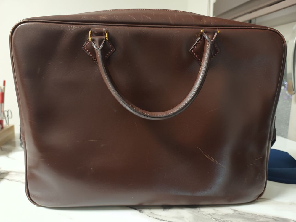 에르메스 정품 가죽 브리프 케이스이에요. 사용감이 많은 제품이라 아주 저렴하게 올립니다 고급스러운 브라운 컬러가 매력적이고, 실용적인 사이즈로 데일리용으로 딱 좋아요. 매장에서 1500만원에 구입했습니다