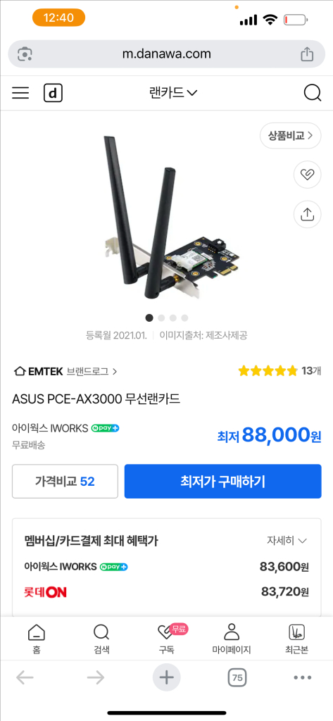 개인정보(거래정보)를 주고받는 행위는 사기에 노출될 수 있으므로 즉시 중고나라로 신고해 주세요ASUS PCE-AX3000 무선랜카드입니다. 고성능 WiFi 6 지원으로 빠른 인터넷 속도를 제공해요. 깔끔한 상태로 잘 관리된 제품입니다. *. 직거래시: 옥수역 7번출구 *. 택배거래시 - 반값 택배시 택배비무료 - 일반택배시 택배비 2000원 추가