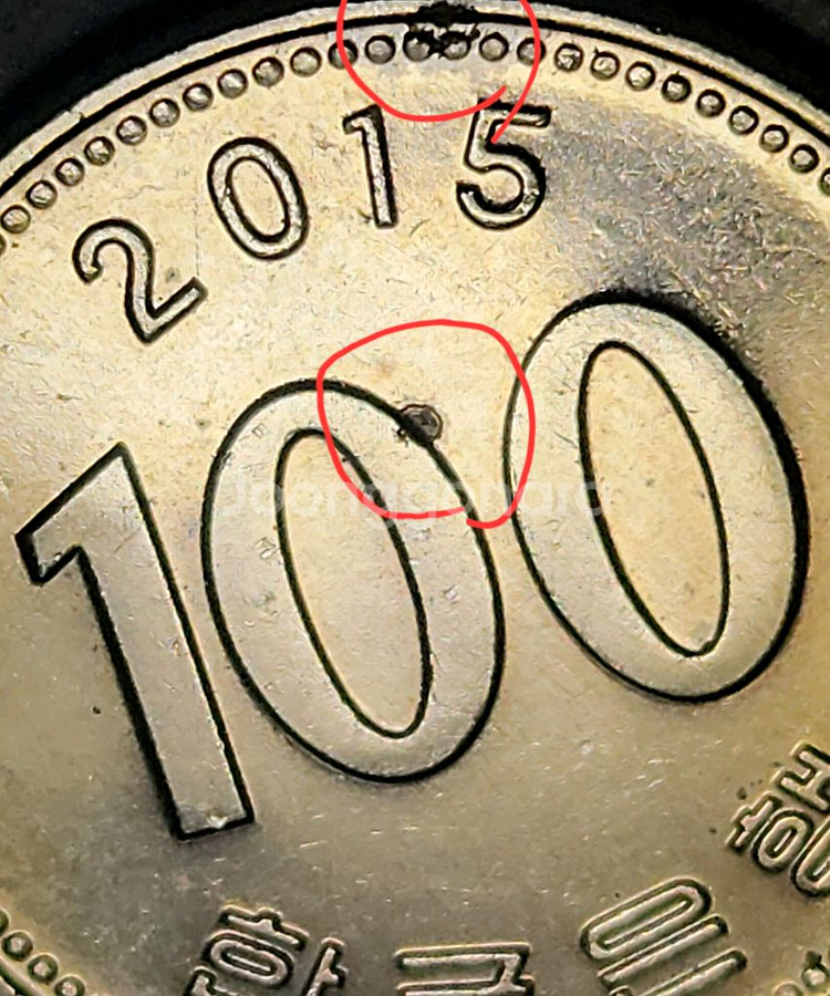 한국은행 2015년도 발행된 100원 동전 - 100원 면에 다이칩 에러 동전입니다. - 초상화 면에 여러곳에 작은 라미네이션 탈락 * 사진은 실물사진입니다. * 택배비는 별도입니다.