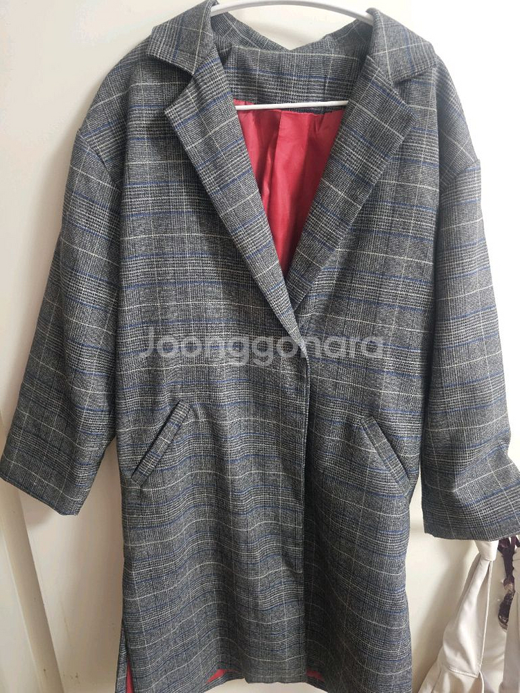 YTMZ 브랜드의 체크 코트입니다 회색 바탕에 파란색 체크 패턴이 들어가 있습니다 안감은 빨간색으로 포인트를 주었습니다 상태는 좋습니다 프리이나 사이즈가 커 88-99분들 입을수있어요