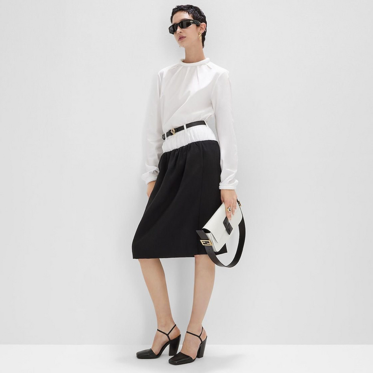 펜디 투톤 스커트입니다. - 모델명: FQ7522-AXB3-F0GME - 사이즈: 75 - 소재: 폴리에스터 89%, 나일론 11% - 제조년월: 23년 9월 아울렛에서 100넘게 주고 샀는데 구입 후 보관만 해놓고 택도 아직 안 떼었어요 어떻게 코디 하냐에 따라 단정하게도, 힙하게도 여러가지로 코디 가능한 치마에요!