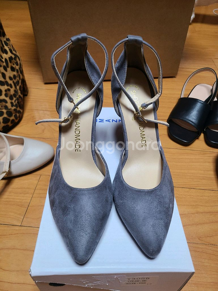 그레이 색상 스웨이드 펌프스 힐입니다 - 사이즈 : 230mm - 굽높이 : 9cm - 앵클 스트랩 디자인으로 발목을 안정감 있게 잡아줘요 세련된 디자인과 편안한 착용감으로 신기 좋아요 박스는 없습니당 *교환,환불 안돼요~~