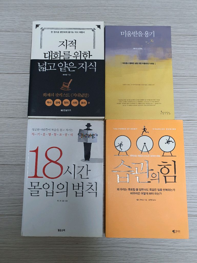 인기 도서 4권을 일괄 판매해요! 지적 대화를 위한 책, 마음받음 기술, 18시간 몰입의 법칙, 습관 힘 관련 도서들로 구성되어 있습니다. 전체적인 상태 충분히 양호합니다. 내부에 기록이나 줄친 거 없습니다. 그래도 중고도서다 맘편히 생각하면 서로 편합니다. 일괄 반값택비 포함 12000원