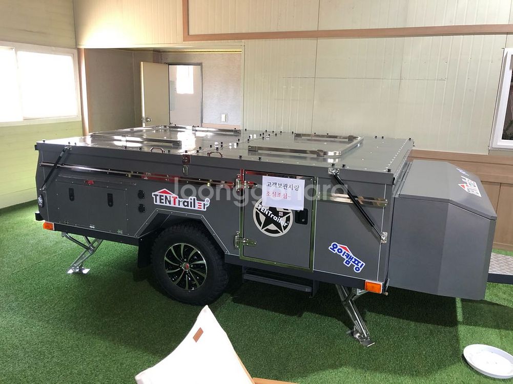 Tent Trailer 텐트 트레일러입니다 전동무버,무시동 히터 빼고 풀 옵션입니다. (에어컨,히터 유) 텐트 및 타프 스커트(개선품으로 풀 교체 했고 교체후 미사용 입니다.) 구매후 10회 미만 사용했고 파손 된곳 없습니다. 회색이며, 캠핑용으로 사용하기 좋습니다. 내부에 침대와 수납공간이 있어 캠핑하기 편리하고, 상태 양호합니다.