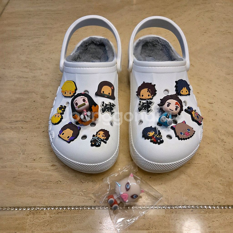 흰색 크록스 정품 털 슬리퍼 정품에 귀멸의 칼날 지비츠로 장식되어 있습니다. 퀄리티 정말 좋습니다. 실물이 끝내줍니다 *^___^* 울 수면 양말 신으면 280이라도 작게 느껴지고 맨발이나 얇은 양말 신으면 맞는데 발등 높으시거나 살찐 분들에겐 작을거 같아요. 270 전후이신 분께 널널하게 맞을거 같습니다. 크록스는 편하게 신어야하니까요. 저한텐 작아서 눈물을 머금고 팝니다. - 겨울에 정말 따뜻하게 신을 수 있어요 - 푹신한 착화감 - 개성있는 디자인 흰색 크록스 털 슬리퍼에 귀멸의 칼날 지비츠 14개 꽂혀있습니다. 털 안감 덕분에 따뜻하고 푹신한 착화감을 느낄 수 있습니다. 추가로 포장도 안 뜯은 귀멸의 칼날 지비츠 하나 더 드려요!