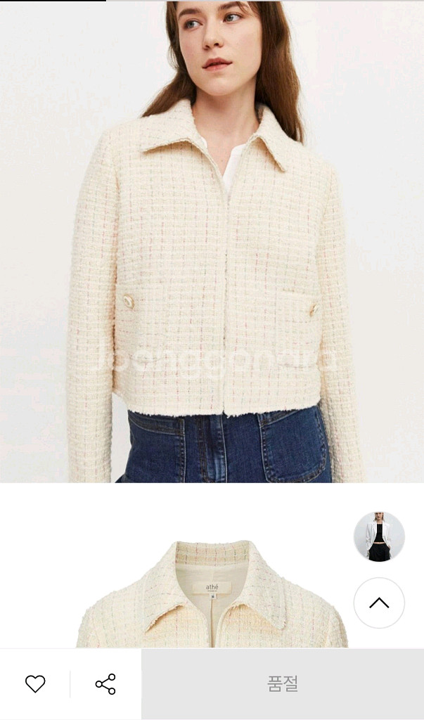 폭닥한 느낌. 사랑스런 컬러감의 트위드 자켓입니다. 실착 1회. 2시간 입었어요 사진이 정말 안나와요ㅠ 사이즈 38이면 66정도인데 많이 크게는 안나와서 55도 적당히 여유핏이고 66도 맞으실거에요~ 사이즈38 아이보리 정가698,000 반품x