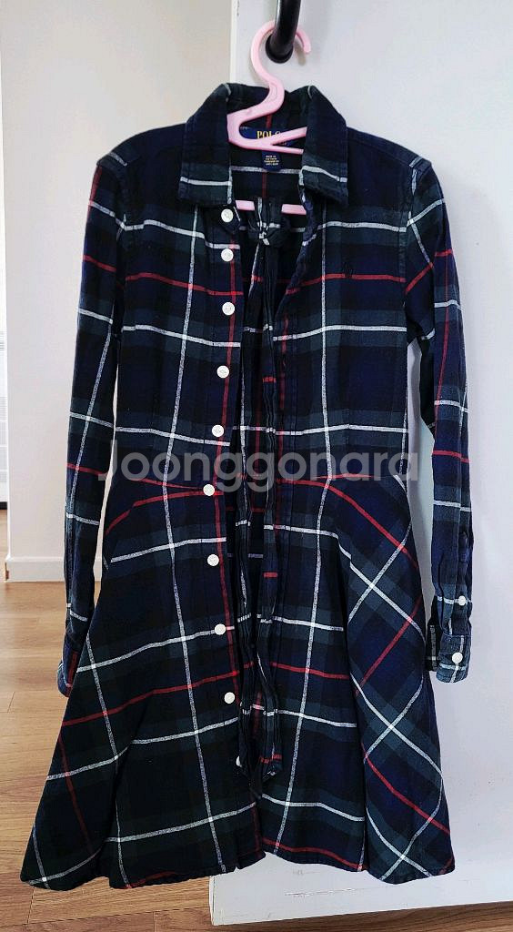 폴로 랄프로렌 셔츠형 원피스(키즈) 팔아요~ 사이즈 7 허리 밑으로 플레어 형태 양쪽으로 주머니 있고 같은 원단의 허리끈 있어요~ 세탁 완료 아이키 125cm