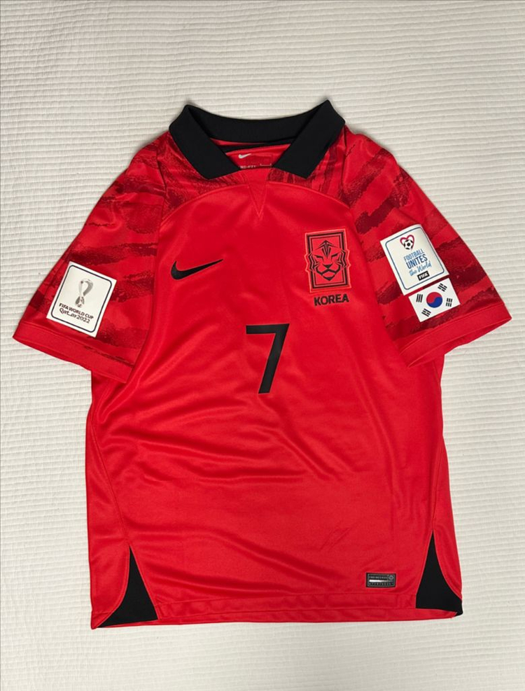 2022 카타르 월드컵 대한민국 국가대표 손흥민 선수 유니폼 사이즈 L입니다. 한 번도 입은 적 없고 월드컵 16강 진출로 기념으로만 보관해둔 상태입니다. 이름 및 번호 마킹 오피셜, 양옆의 월드컵 및 태극기 패치들은 자컷입니다.