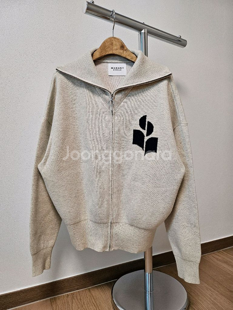 마랑 에뚜알 브랜드의 베이지 컬러 니트 집업 자켓이에요. 앞면에 블랙 로고가 포인트로 들어가 있고, 전체적으로 상태가 양호해 보입니다. 가격 인하해서 판매합니다! 백화점정품구매 사이즈 55 상태좋아요 구매원하시면 문자주세요 010-8576-0708