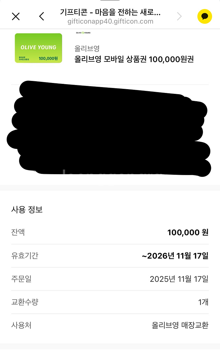 올리브영에서 사용 가능한 10만원 모바일 상품권이에요. 유효기간은 2026년 11월까지라서 빠른 거래 원해요! 총 3장 있구용 채팅 부탁드려요!!