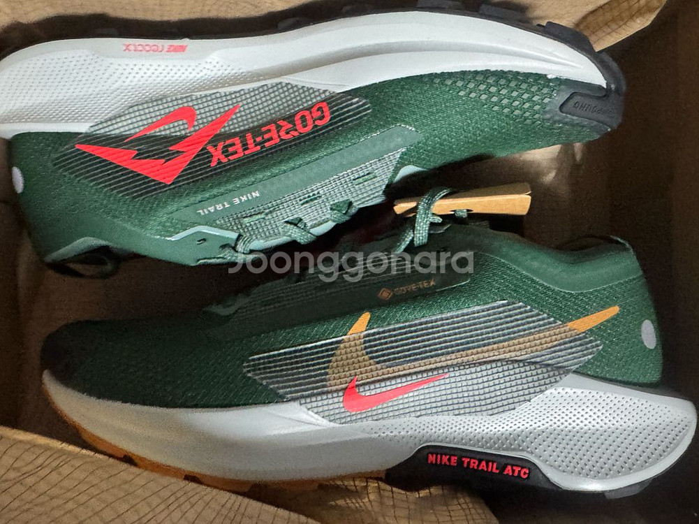 새상품 나이키 페가수스 트레일 5 GTX 운동화예요. 그린 컬러에 레드 포인트가 들어간 디자인이 정말 멋있고, 박스와 함께 완전 새제품 상태입니다!