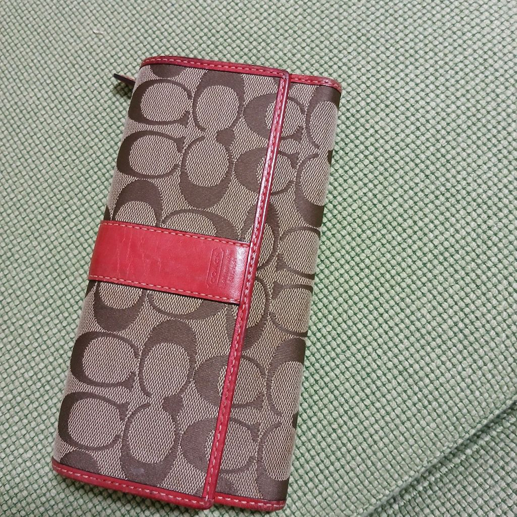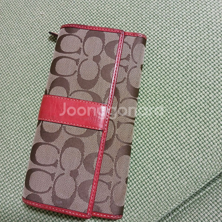 코치 시그니처 패턴의 지퍼 장지갑이에요. 브라운 컬러에 레드 포인트가 들어가 있고, 카드 수납공간과 지퍼 포켓이 있어 실용적입니다. 사용감은 있지만 전체적으로 깔끔한 상태예요.