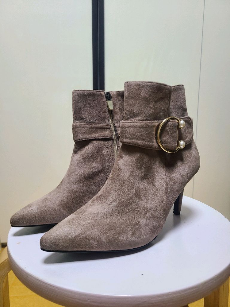 스웨이드 재질의 앵클 부츠입니다 사이즈 : 베이지 235mm, 버건디 250mm 굽높이 : 8cm 진주 버클 장식이 포인트로 되어있습니다 안감은 기모천으로 되어있구요 안쪽 지퍼가있어서 신고 벗기 편해요 신어보지않른 새상품입니다 *교환,환불 안돼요~