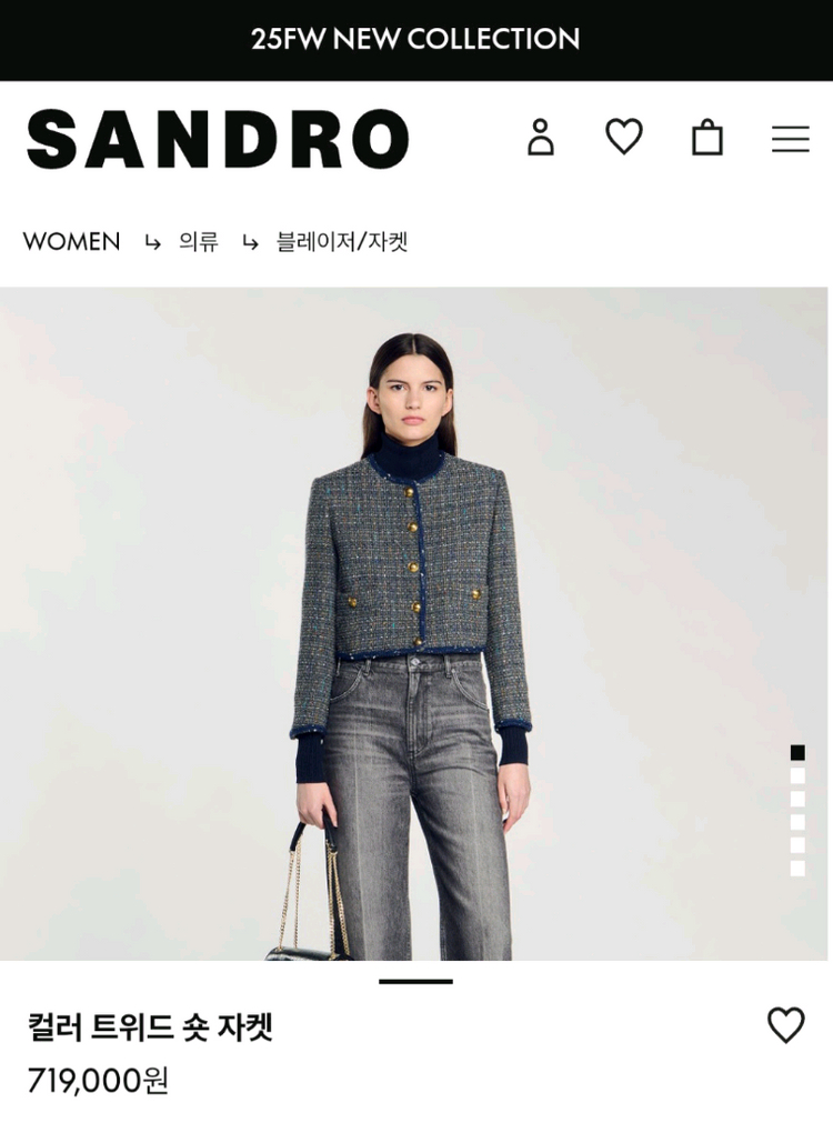 산드로 트위드 숏 자켓 새 상품 판매합니다. 고급스러운 컬러감의 트위드 소재로 제작되었습니다. 숏한 기장감으로 다양한 하의와 매치하기 좋습니다. 고급스러운 디자인으로, 다양한 스타일에 잘 어울립니다 - 모델 번호: SF24A3FRJKH - 사이즈: 36 상태는 사진과 같습니다 구입가 719000 품절된 제품입니다 - 가슴반품 47 총장 45 문의 없으시면 바로 안전결제해주시면 됩니다!