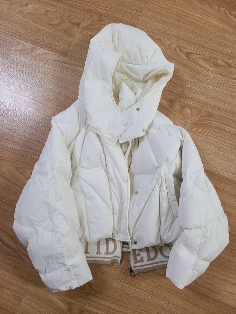화이트 패딩 점퍼예요. 후드가 있고 깔끔해 보여요. 상태 양호한 구스 중고 제품입니다. 세탁완료 보관하니 약간 보관얼룩 몇군데 보여요 예민한 분 패스~~ 55-66분 약간 크롭 오버핏으로 입으면 이뻐요 가슴단면65정도 기장57정도 착불이고 가격 내렸어요 이것저것 문의 안받아요 구매할 분만 챗주세요