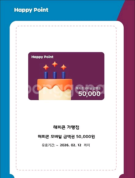해피콘 5만원 모바일 금액권이에요. 유효기간은 2026년 2월 12일까지 입니다!