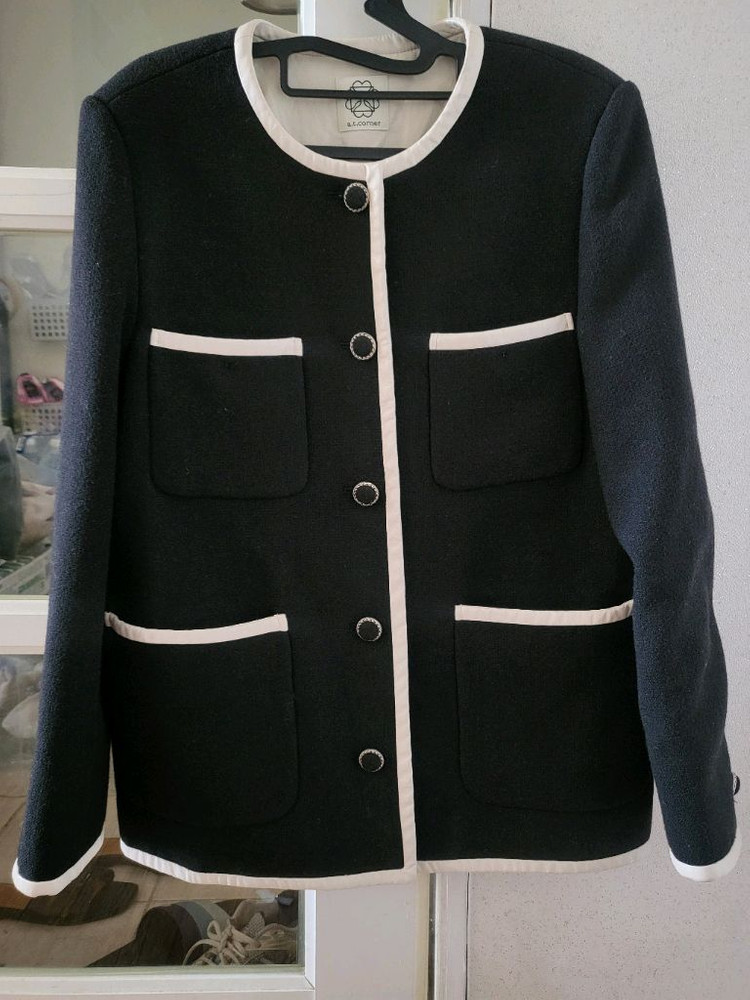 앳코너 브랜드의 블랙 컬러 코트예요. 화이트 파이핑 디테일과 골드 버튼이 포인트로 되어있고, 전체적으로 깔끔한 상태입니다. 55사이즈 고급스럽고 이뻐요 씨유 반값택배 택포에요