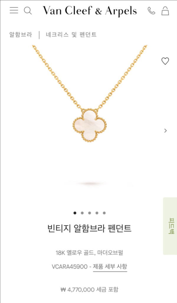 ✔️새상품 그대로! 택도 제거하지 않은 제품입니다. Van Cleef & Arpels 빈티지 알함브라 펜던트(18K 옐로우 골드 + 마더오브펄) 로, 빛에 따라 은은하게 반짝이는 진주광이 정말 예쁘게 살아있어요. ✔️ 2025년 9월 말, 현대백화점 무역센터점에서 정식 구매한 정품입니다. 인보이스, 구매 영수증 포함 풀 세트 그대로 보관 중이라 선물용으로도 완벽해요. ✔️ 구성품 그대로: 정품 박스, 쇼핑백, 인보이스, 구매영수증 모두 포함됩니다. 한 번도 착용하지 않아 기스·사용감 전혀 없는 완벽한 상태이며, 매장에서 바로 받아온 느낌 그대로 보실 수 있어요. 고급스러운 골드와 깨끗한 자개 조합이 데일리룩, 어떤 스타일에도 은은하게 포인트가 됩니다.