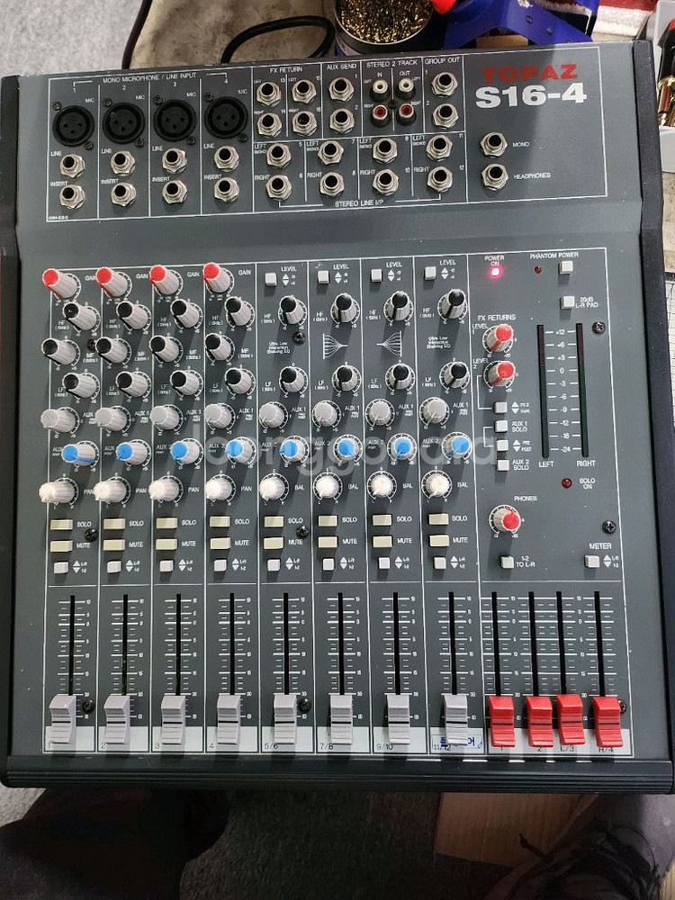 16채널 믹싱 콘솔입니다. 다양한 입력 단자와 EQ 컨트롤이 있어 음향 작업에 유용해요. 사용감은 있지만 작동 상태 양호합니다.