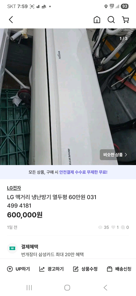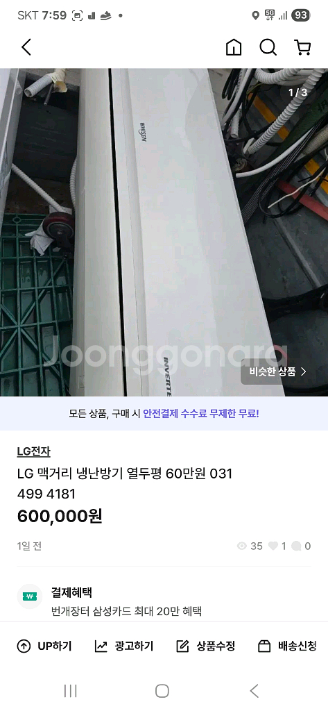 개인정보(거래정보)를 주고받는 행위는 사기에 노출될 수 있으므로 즉시 중고나라로 신고해 주세요LG 인버터 에어컨 12평형 판매합니다. 실외기와 실내기가 모두 포함되어 있고, 사용감은 있지만 정상 작동하는 상태예요. 냉난방 겸용으로 사용하기 좋습니다. 031 499 4181 긴급수리 판매 매입 모든 가전제품 사고 팔고 오래된 기계 환영