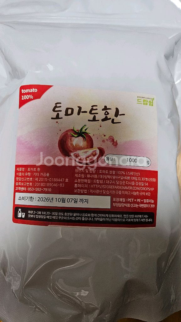 개인정보(거래정보)를 주고받는 행위는 사기에 노출될 수 있으므로 즉시 중고나라로 신고해 주세요토마토환1kg 새제품이에요. 포장 상태가 깨끗하고 좋아 보입니다. 건강 관리ㆍ전립선에 좋음 구입가 : 45,000