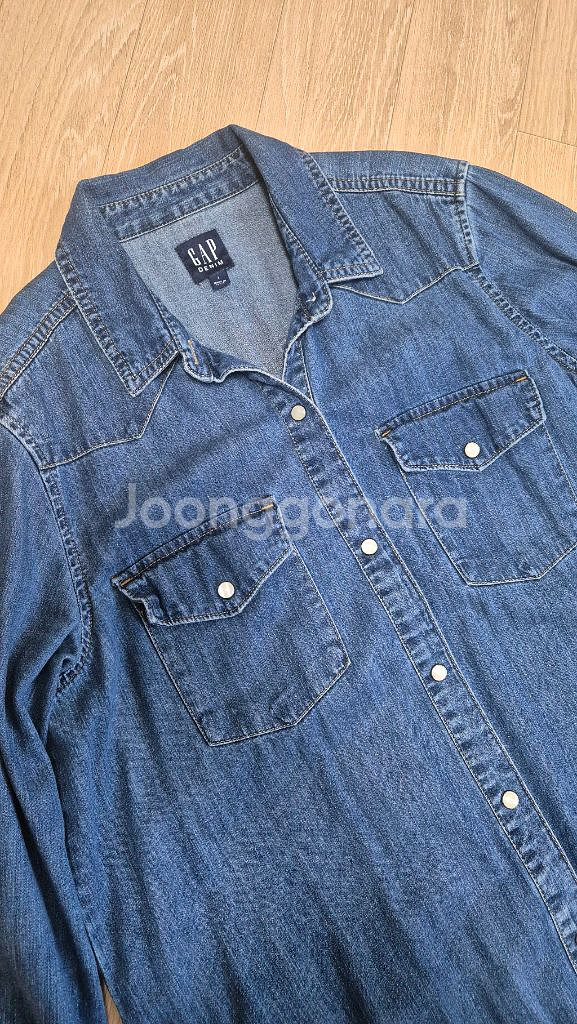 데님 소재의 셔츠 원피스예요. 앞면에 포켓 디테일과 클래식한 버튼다운 스타일로 되어있고, 전체적으로 깔끔한 상태입니다.