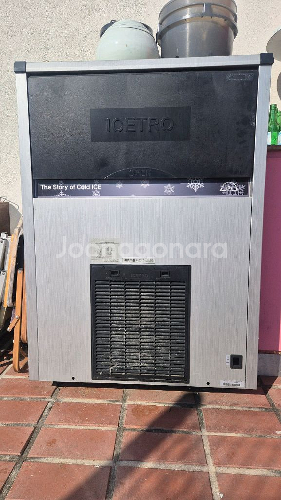업소용 제빙기입니다. 실버와 블랙 컬러로 깔끔한 디자인이에요. 보관상 먼지는 있지만 작동 상태 양호합니다. 닦으면 깨끗합니다. 100리터