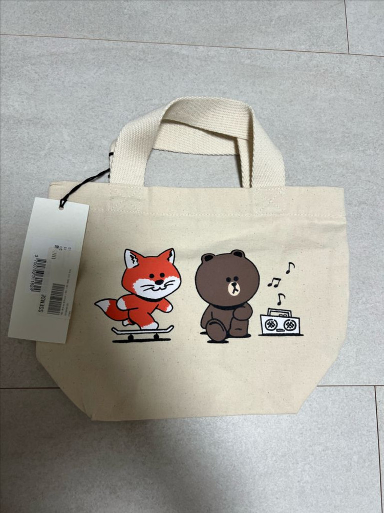 메종키츠네와 린프렌즈 콜라보 에코백이에요! 귀여운 라이언과 베베 캐릭터가 그려져 있고, 태그도 달린 새상품 상태입니다. 실용적이면서도 너무 사랑스러워요.