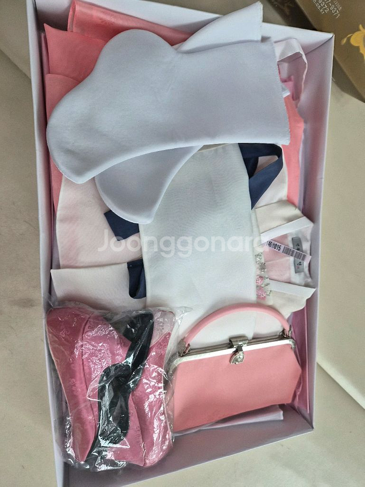 여성 한복 풀세트 판매합니다 서울 종로구에서 80만원대로 직접 맞춘 한복 입니다 결혼식 촬영때 몇시간 잠깐 실내에서만 입었어요 드라이크리닝 해놨구요 - 핑크색 비단치마와 흰색 저고리, 핑크색 가방, 흰색 버선, 핑크색 꽃신(230mm), 풍성한 속치마까지 한 세트입니다. - 꽃신 밑바닥에 230이라고 적혀 있습니다. -160cm 55-66 사이즈 이쁘게 맞아요 -유행 안타는 색감과 디자인 - 박스에 담아서 드립니다